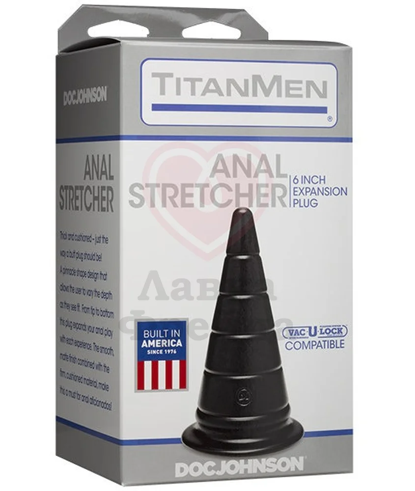 Огромная анальная пробка Titanmen Anal Stretcher оснащена рельефным стволом для усиленной стимуляции нервных окончаний. Пробка имеет конусообразную форму пирамиды, расширяющуюся к низу до 7 см. Гладкий упругий не пористый материал идеален для анального стимулятора, первое время имеет стойкий запах - мойте с мылом или очищающим средством. Использовать можно с лубрикантом на водной и силиконовой основе, анальным или для фистинга.