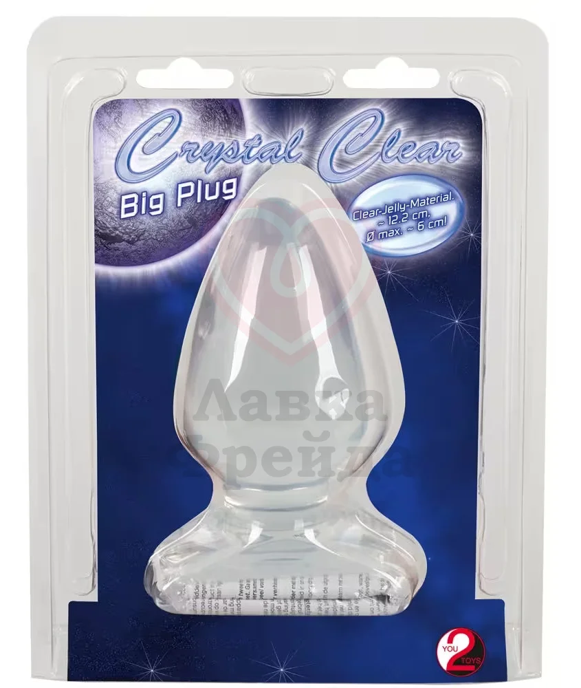 Анальная пробка Crystal Clear Big Plug выполнена из прозрачного гладкого не пористого материала ПВХ, с которым можно использовать лубриканты на водной и силиконовой основе, анальные или для фистинга. Размер довольно объёмный: хоть длина проникновения и составляет 11 см, максимальный диаметр большой - 6 см. Не забывайте очищать игрушку с водой и мылом, для большей гигиены добавляя специальное средство.
