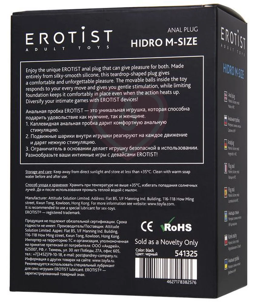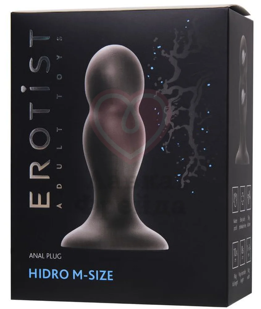 Внутри плага Erotist Hidro M находятся два движущихся шарика, которые будут менять своё положение при каждом движении, усиливая анальную стимуляцию. Рабочая длина - 8,5 см, диаметр - 3,4 см, что создаёт ощутимое растяжение, обостряя чувствительность и повышая градус возбуждения. Округлый кончик и плавный изгиб девайса обеспечивает комфортное введение, а расширенное основание не позволяет пробке полностью уйти внутрь.
