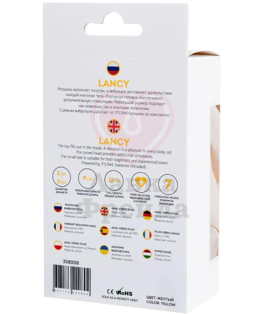 Анальная пробка ToDo by Toyfa Lancy сочетает классическое удовольствие от введения и ощущения наполненности с вибрацией, для более многогранной стимуляции. За вибрацию (7 режимов) отвечает съёмная вибропуля, работающая от 3-х батареек AG13, которые идут в комплекте с девайсом. Плавные изгибы плага облегчают введение, а широкое основание-ограничитель гарантирует безопасность, не позволяя втулке полностью уйти внутрь.