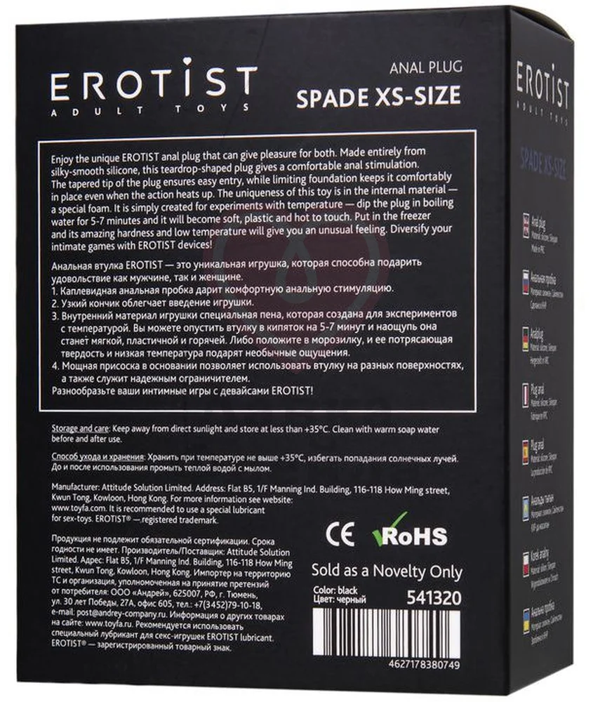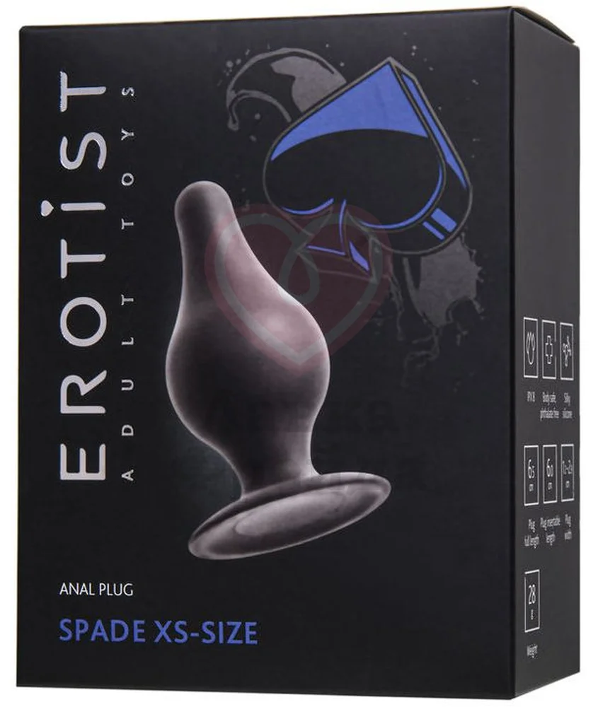 Erotist Spade XS - пробка в виде масти "пики" с тонким носиком, идеально подходящая для первого знакомства с анальной стимуляцией. Рабочая длина - 6 см, максимальный диаметр - 2,9 см, что обеспечивает деликатное воздействие без дискомфорта и боли.
