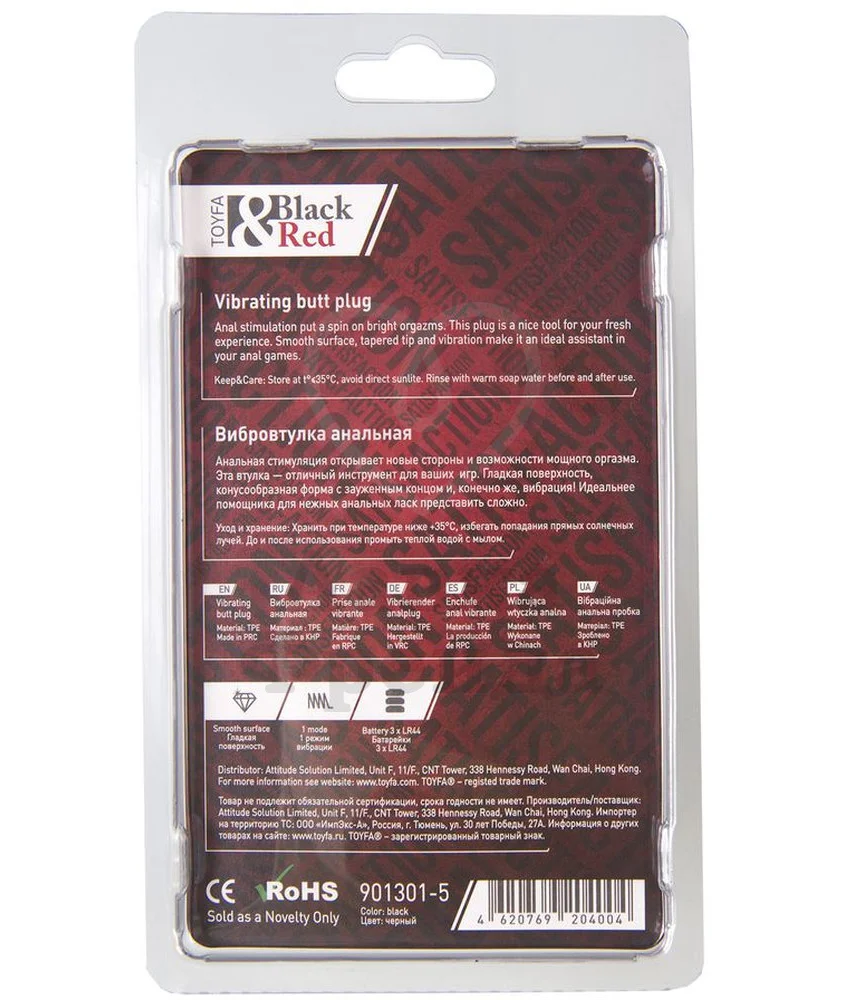 Анальная пробка Black Red by Toyfa - длинная зауженная модель со скругленным кончиком, который максимально облегчает введение игрушки. Изготовлено из термопластичного эластомера высшего качества - тактильно приятный материал чёрного цвета, совместимый с лубрикантами на водной основе. Наслаждение от ощущения наполненности будет усиливать режим вибрации, который активируется нажатием всего на одну кнопку. Плаг работает от 3 батареек типа LR44. Широкий ограничитель не даст пробке проскользнуть внутрь. Обрабатывать специализированным спреем для игрушек или мыть обычным мыльным раствором.