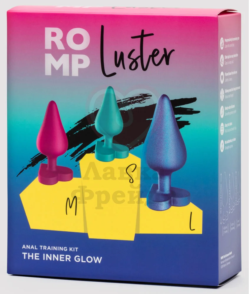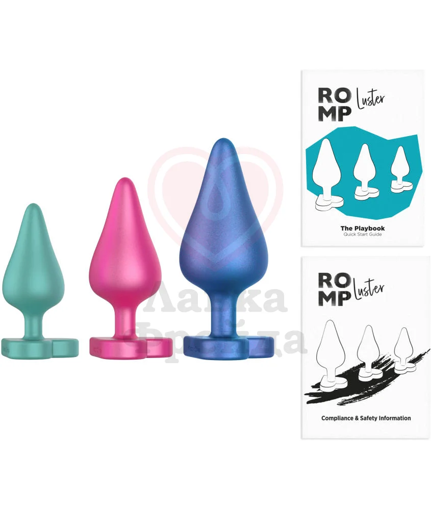Комплект Romp Luster состоит из трёх анальных пробок, длина которых постепенно увеличивается от 7,4 до 10,6 сантиметров. Каждая пробка имеет узкий тонкий наконечник, облегчающий введение втулки в анус. Тонкая ножка заканчивается широким ограничителем в форме сердечка, который не даёт плагу провалиться внутрь, обеспечивая полную безопасность использования игрушки.