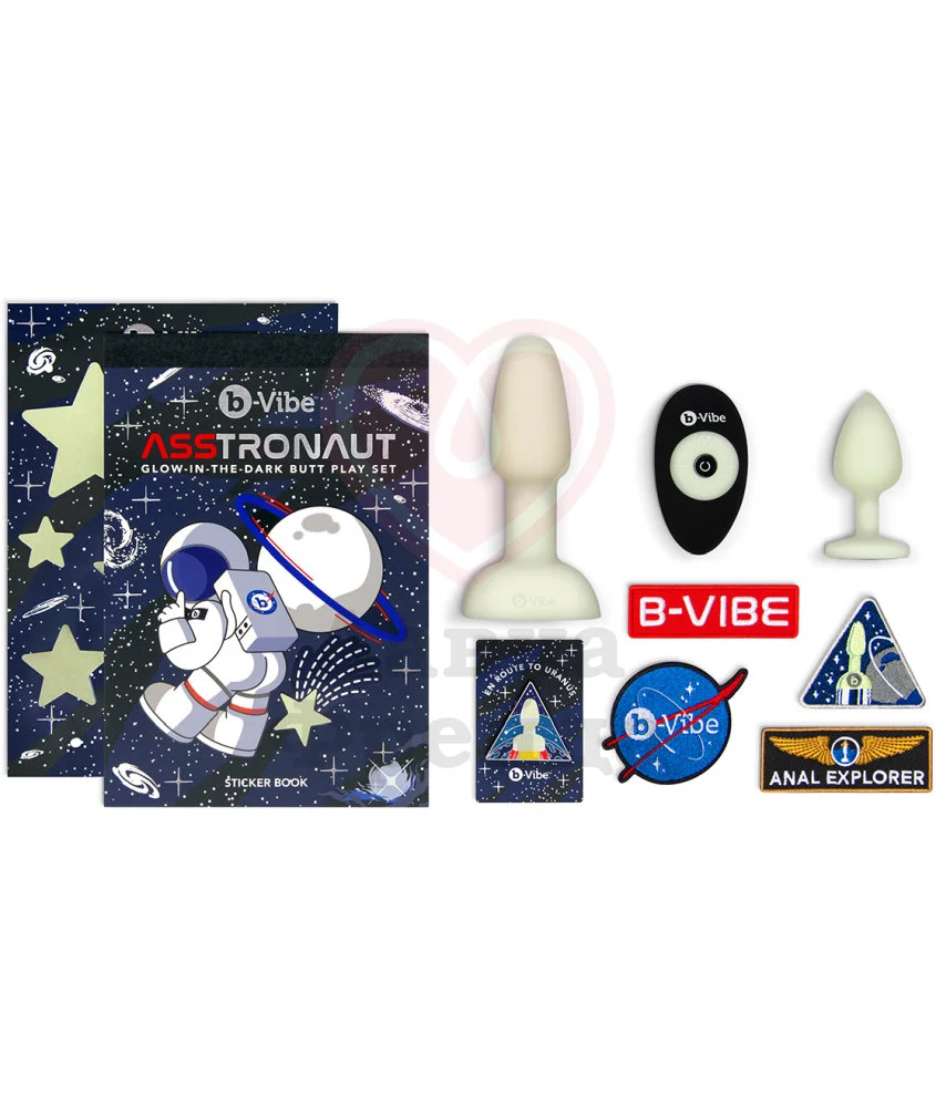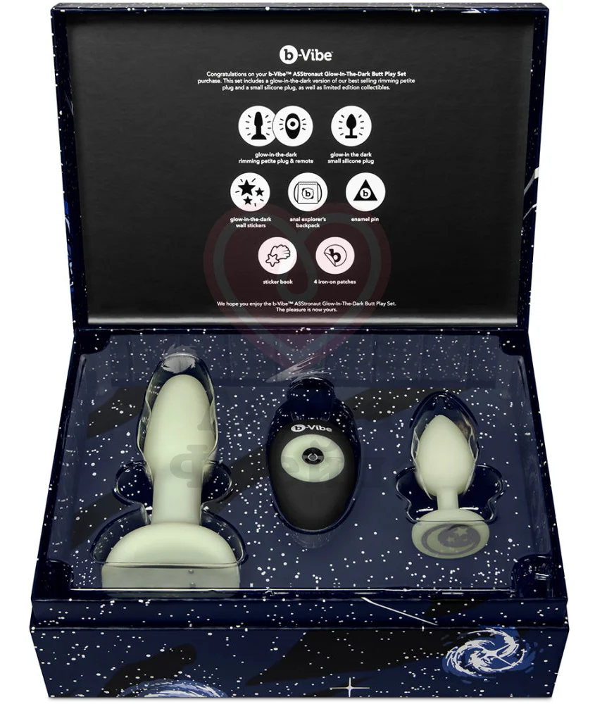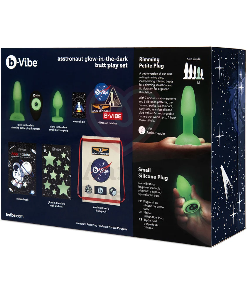 Комплект Asstronaut Glow In The Dark Set создан для космического удовольствия от анальной стимуляции. Состоит из двух светящихся в темноте плагов - маленького без вибрации и побольше, имеющей 6 вибро-режимов и 7 вариантов вращения. Вторая пробка может управляется при помощи дистанционного пульта, а перезаряжается через USB кабель - после полной зарядки гарантируется до 1 часа беспрерывной работы.