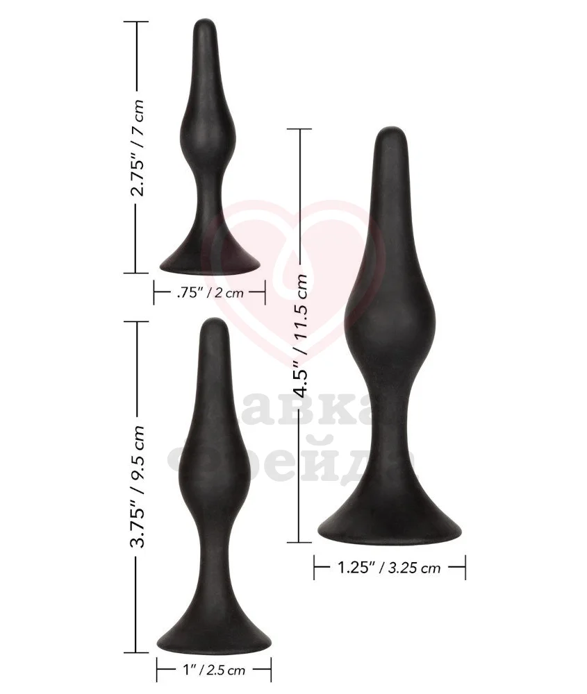 Набор из 3 анальных пробок, выполненных из медицинского силикона и обладающих специальной формой. Тонкий кончик обеспечивает легкость введения, объемный шарик приятную стимуляцию, а присоска в основании дает безопасность и удобство использования. Даже самая большая игрушка в наборе имеет комфортный размер для новичка: