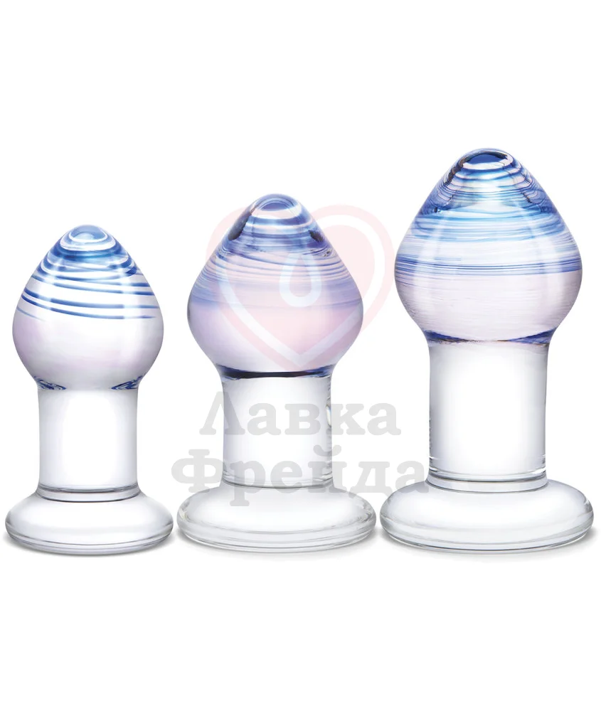 Набор Pleasure Droplets состоит из трех стеклянных плагов разной высоты и диаметра, поэтому комплект понравится и новичкам, и профессионалам анальных удовольствий. Каждая пробка сделана из прозрачного стекла, украшенного контрастными голубыми разводами.