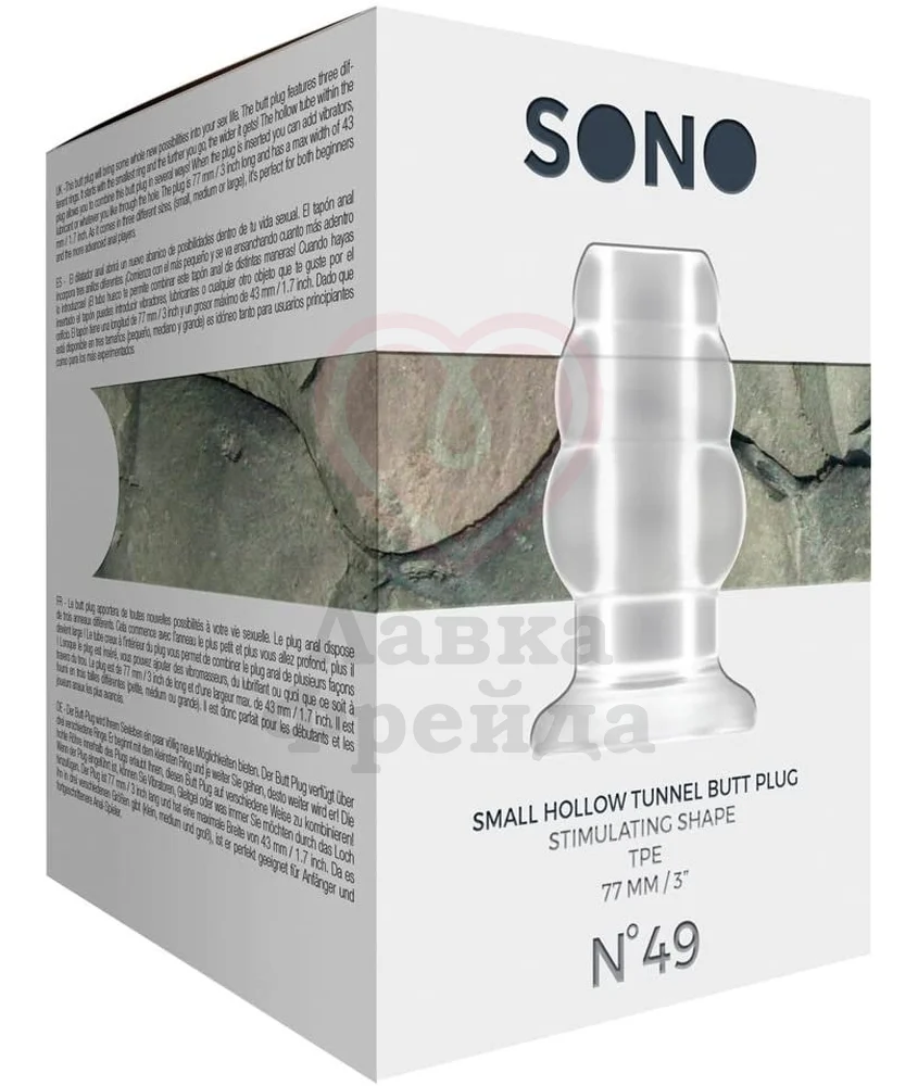 Полупрозрачная пробка-тоннель Sono №49 имеет необычную форму с постепенно увеличивающимися ребрышками для чувственной стимуляции. Длина проникновения составляет 6,5 см, а максимальный диаметр 4,3 см. В центре пробки расположено сквозное отверстие для дополнительных необычных игр: добавление лубриканта или других игрушек со стопером и вибрацией.