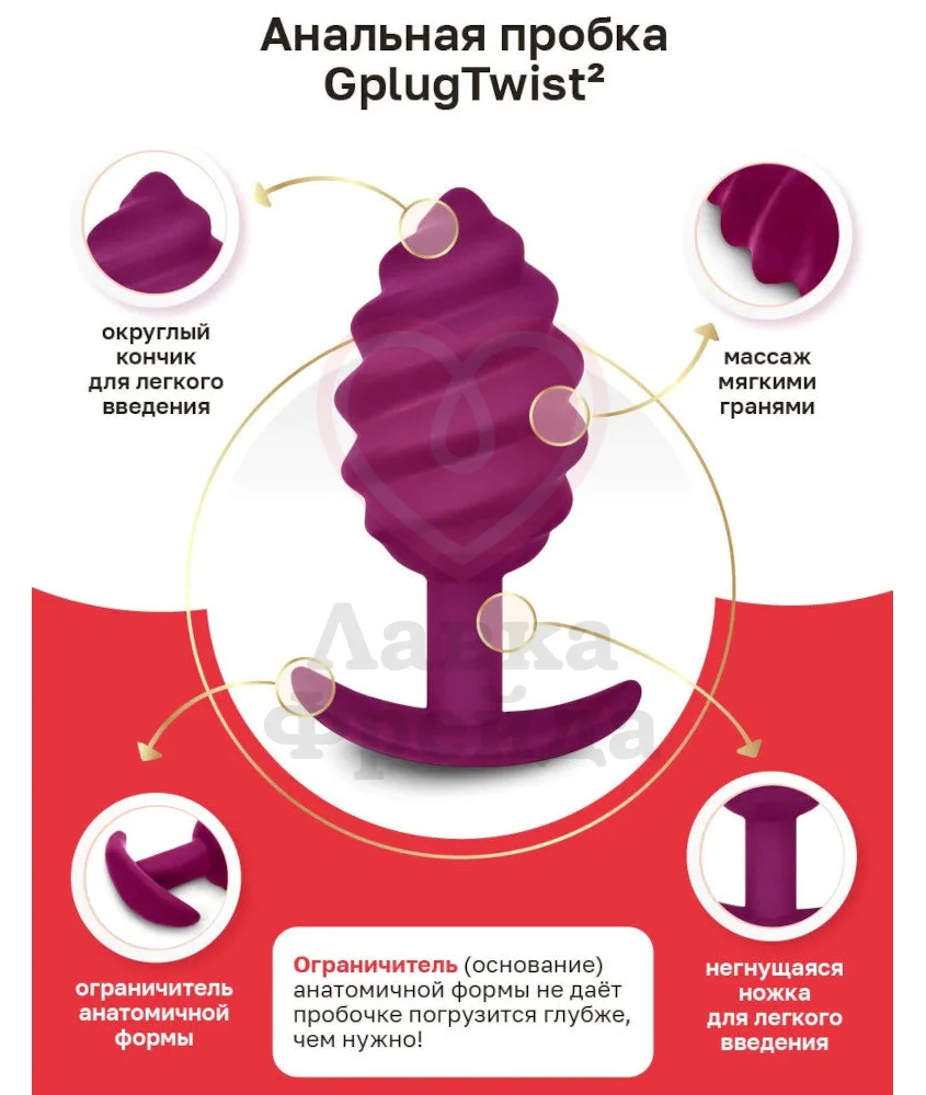 Игрушка имеет негнущуюся ножку и зауженный кончик для легкости введения. В отличие от предыдущей модели - Gvibe Gplug Twist, у версии Twist 2 нет вибрации и есть узкий ограничитель, поэтому пробка подойдет для длительного ношения и использования по время проникающего секса.