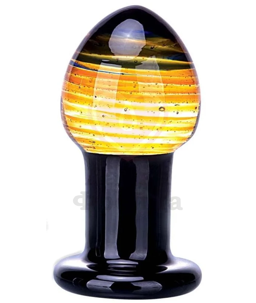 Красивая втулка для анальной стимуляции общей высотой вместе с основанием 9 см и с максимальным диаметром головки 4 см. Головка с синей макушкой и с медовыми разводами внутри.