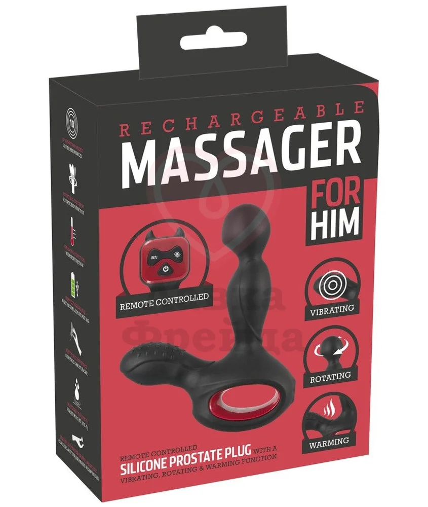 Стимулятор простаты You2Toys Massager for him обладает целыми тремя функциями: вибрацией, ротацией и нагревом — в общем, всем тем, что может пригодиться для доставления качественного удовольствия. Основная часть игрушки с длиной проникновения 9 см и диаметром на самом кончике 3 см имеет форму с расширяющимся и сужающимися частями для более ярких ощущений.