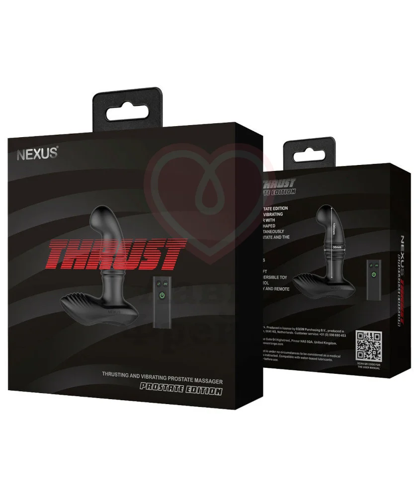 Nexus Thrust – стимулятор простаты с двумя функциями: возратно-поступательными движениями и вибрацией, которыми можно управлять при помощи пульта. Массажер подходит для двойного воздействия: длинный кончик предоставляет яркие ощущения от пульсирующих движений вперед-назад, а основание порадует вибрацией на промежности — для дополнительной стимуляции. Длина проникновения составит 10 см с максимальным диаметром от 3,5 до 3,8 см. Кончик имеет 3 скорости движений, а основание обладает 6 режимами вибрации — управлять моторчиками можно вместе или раздельно при помощи дистанционного пульта на расстоянии до 8 метров. Стимулятор Nexus Thrust и пульт из набора полностью перезаряжаемые и водонепроницаемые для удобства использования.