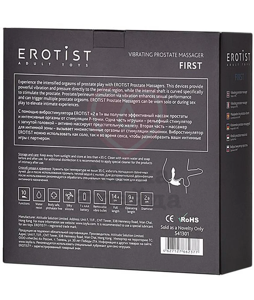 Стимулятор Erotist First разработан для точечной стимуляции предстательной железы и усиления сексуального удовольствия. Крупная фактурная головка проникающей части целенаправленно воздействует на простату, а нижняя часть эффективно массирует промежность 10 режимами вибрации.