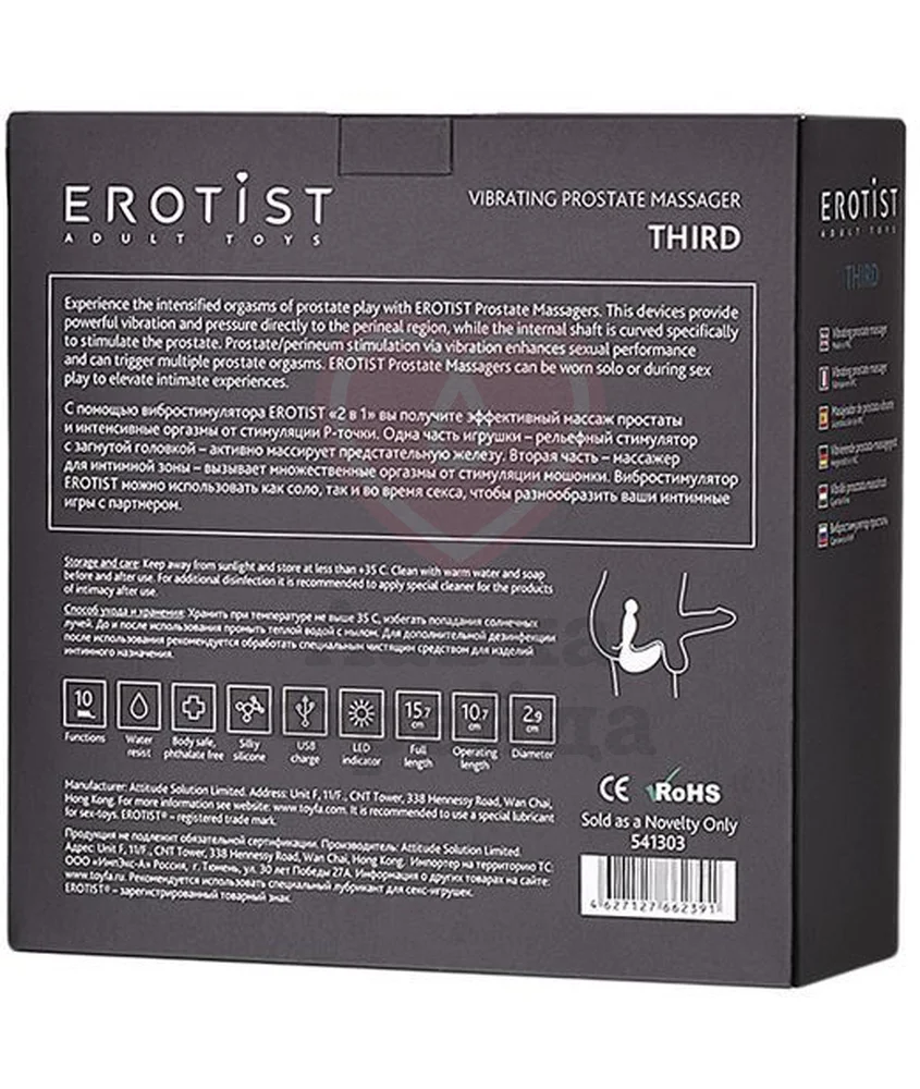 Стимулятор Erotist Third имеет эргономичный изгиб, повторяющий анатомические особенности тела, что обеспечивает точечную стимуляцию предстательной железы. Кончик проникающей части слегка утолщён для более эффективного воздействия на простату. Поверхность гладкая, но не скользящая, что исключает риск случайного смещения массажёра