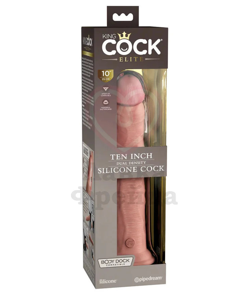 Серия реалистичных фаллоимитаторов King Cock Elite выполнена из качественного медицинского силикона Elite Silicone, который передает правдоподобные ощущения как никогда прежде. Версия Dual Density обладает двойным слоем материала: бархатистый снаружи и соблазнительно упругий внутри — фаллоимитатор приятен на ощупь и максимально комфортен при использовании. Анатомический дизайн порадует проработанными деталями: выраженной головкой и слегка изогнутым стволом с венками. Длина проникновения модели 10 дюймов — составляет 25,5 см, а максимальный диаметр 5 см. На основании расположена присоска, чтобы иметь возможность закрепить фаллоимитатор на плоской поверхности или трусиков для страпона.