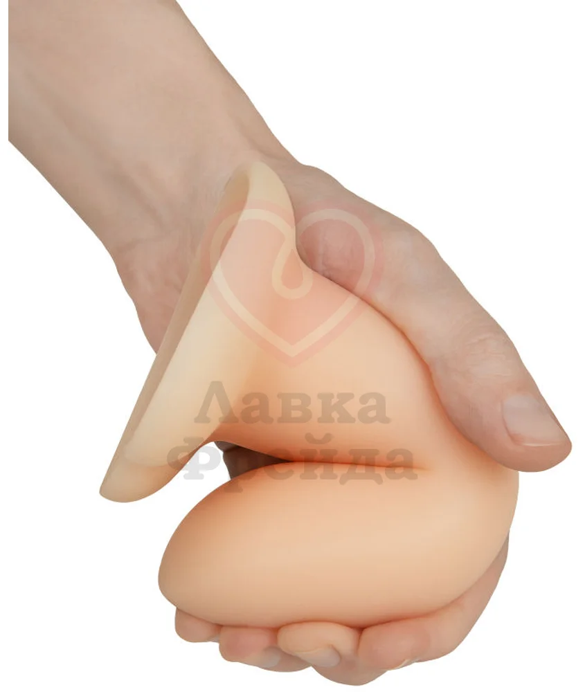 Выполнен из гипоаллергенного силикона телесного цвета, совместимого с лубрикантами только на водной основе. Присоска, сделанная в форме сердечка, надёжно крепится практически на любую плоскую поверхность, а также подходит к большинству систем страпона. Чтобы очистить, промойте игрушку тёплой водой и мылом, а затем обработайте специальным антибактериальным средством.