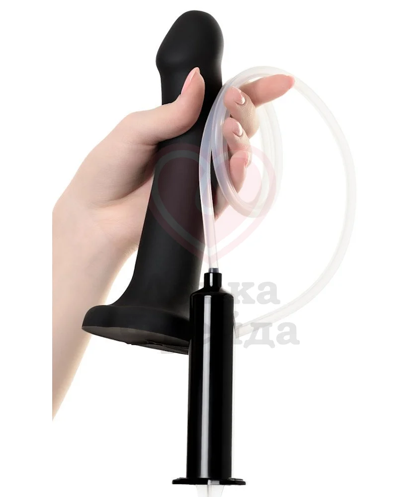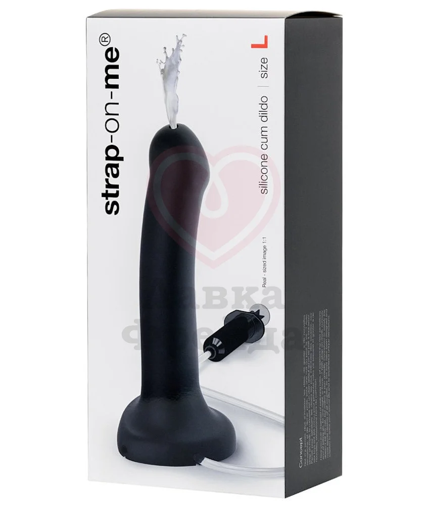 Фаллоимитатор с эффектом семяизвержения Strap-on-me имеет в основании удобную присоску, которую можно закрепить на плоской поверхности или же к трусикам для страпона с соответствующим креплением. Фаллоимитатор выполнен из медицинского силикона и дополнен специальной трубочкой и небольшой ёмкостью 30 мл для введения жидкости — это может быть специальный лубрикант, имитирующий сперму, или же обычная вода. Длина трубочки 82 см.