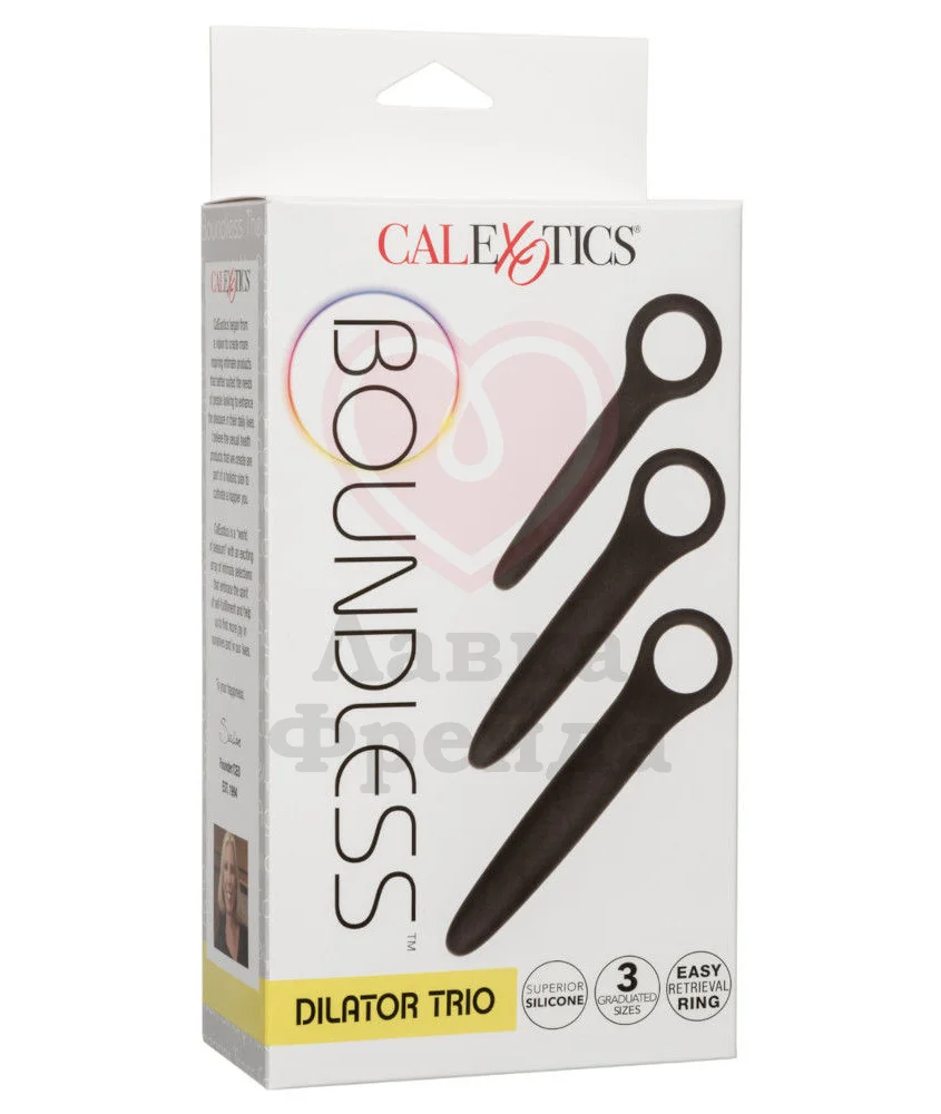 Набор Boundless Dilator Trio — включает в себя 3 тонких фаллоимитатора с колечками на основании, которые удобно использовать, чтобы привыкнуть к проникновению. Игрушки в наборе выполнены из медицинского силикона в одном дизайне, но в разных размерах — постепенно и незначительно увеличиваясь в длине и диаметре. Колечки на основании помогают контролировать стимуляцию и обеспечивают удобство применения.