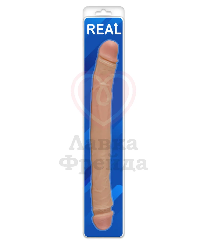 Двухсторонний фаллоимитатор Real имеет реалистичный дизайн с двумя выраженными головками, гибким стволом и рельефными венками. Общая длина составляет 39 см, а максимальный диаметр 4 см. Игрушка может быть использована как для соло удовольствия, так и в паре — два схожих кончика доставят приятные ощущения обоим партнерам. Материал игрушки — ПВХ совместим с разными лубрикантами по вашему выбору, очищать его можно со специальными средствами для наилучшего результата.