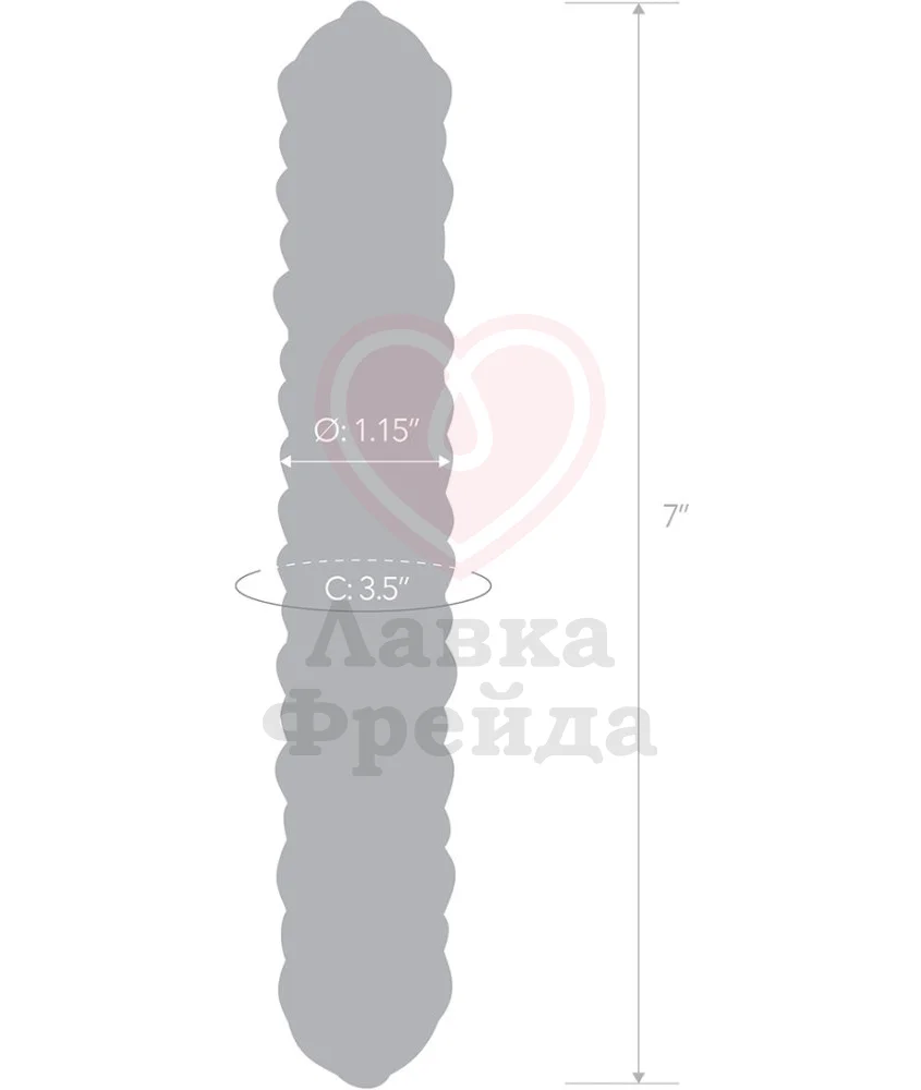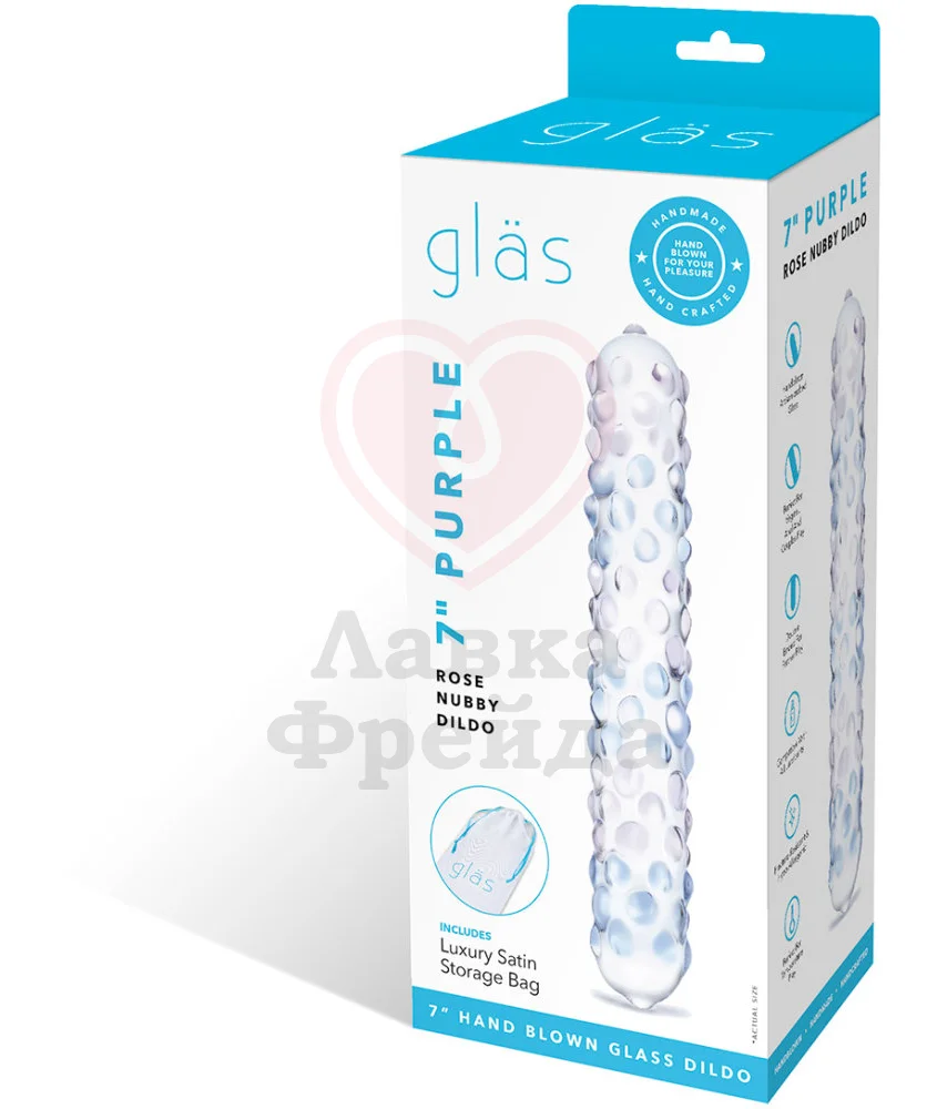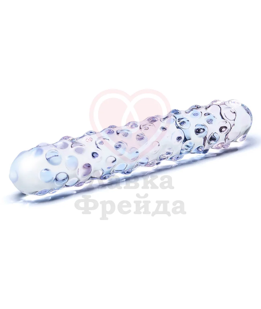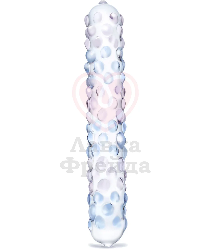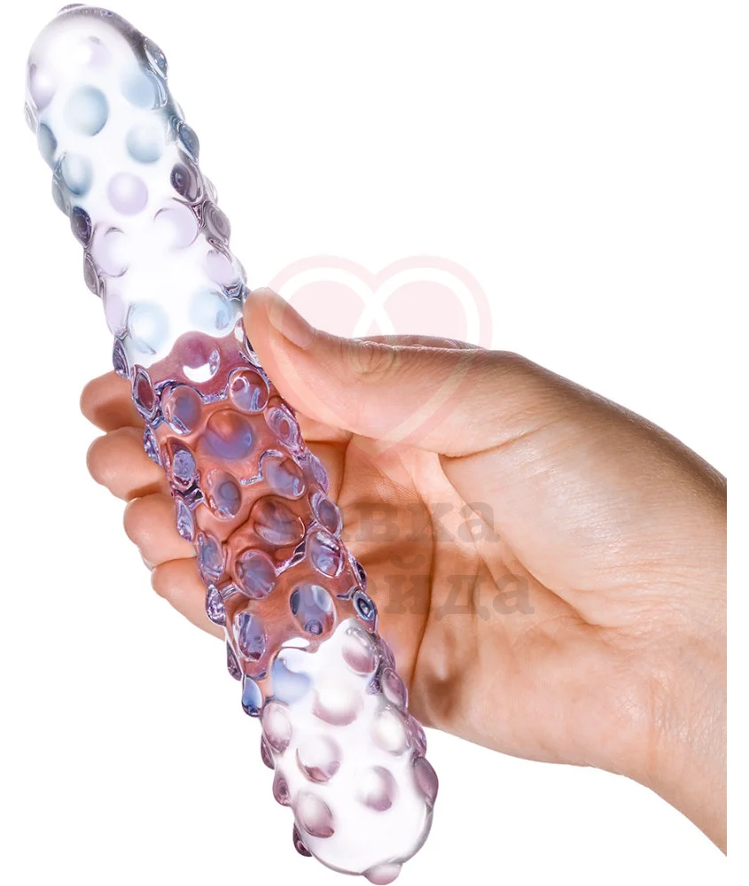 Двухсторонний стик из прозрачного закаленного стекла нежно-фиалкового и бледно-розового цвета. Все тело стика покрыто рельефными точками для стимуляции стенок влагалища. Длина стика 17,5 см, диаметр 2,5 см.
