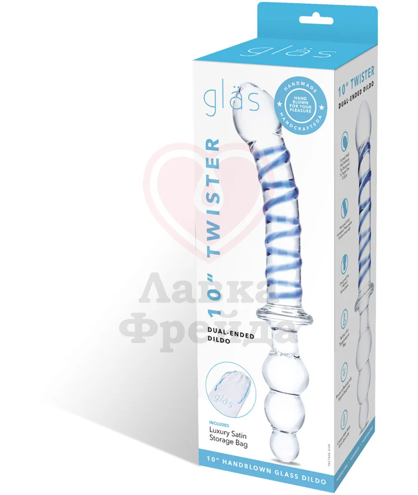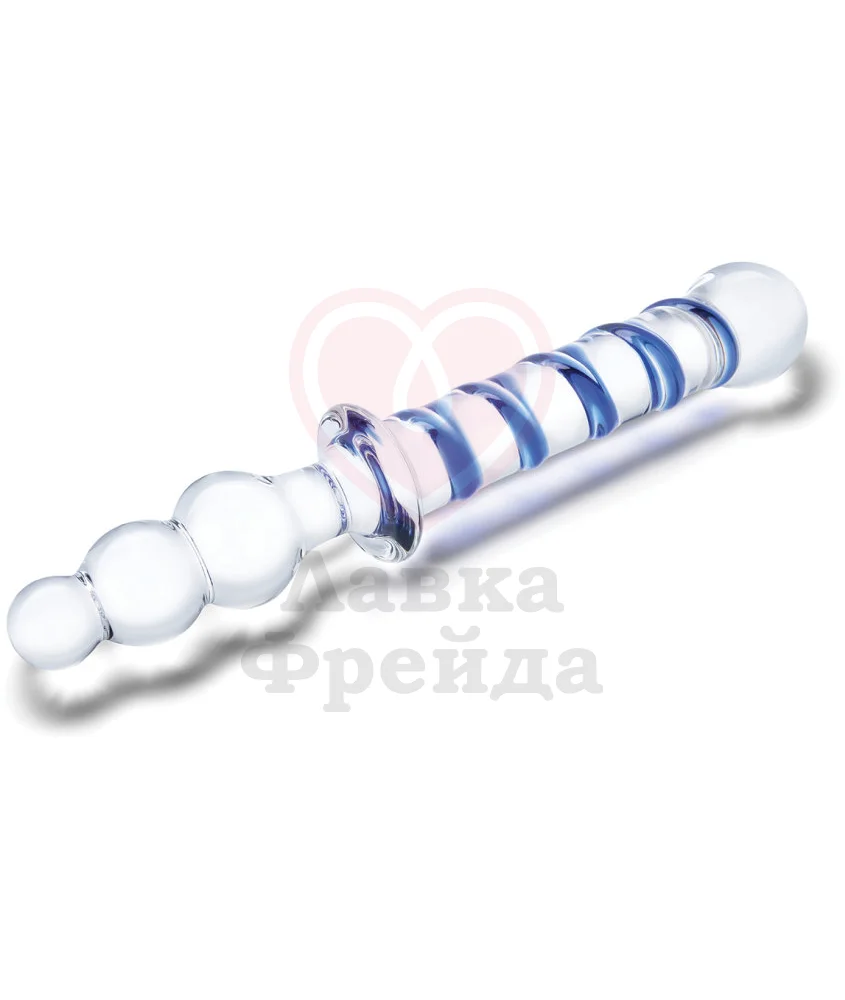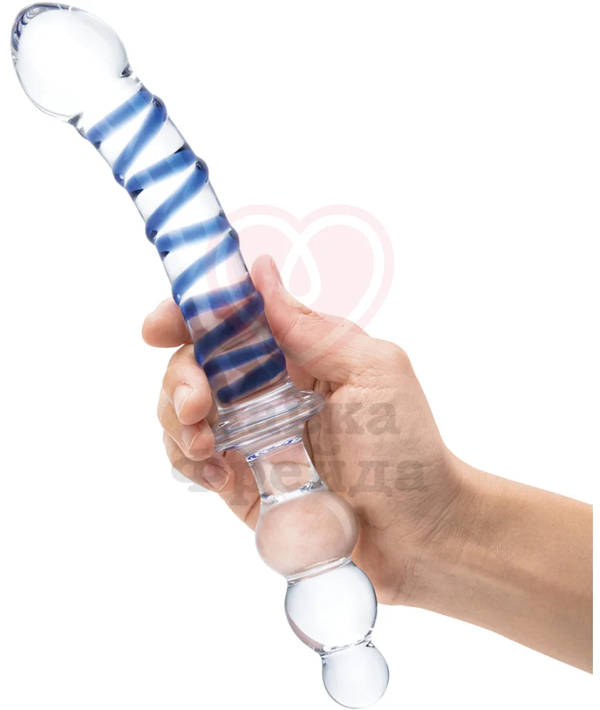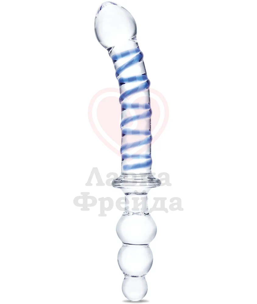 Двусторонний фаллоимитатор Glas Twister состоит из двух половинок, отличающихся друг от друга. Первая - слегка изогнутый ствол, украшенный контрастным синим узором и дополненный крупной, четко очерченной головкой с заостренным кончиком. Вторая - анальная елочка, сделанная из трех шариков, каждый из которых чуть больше предыдущего.