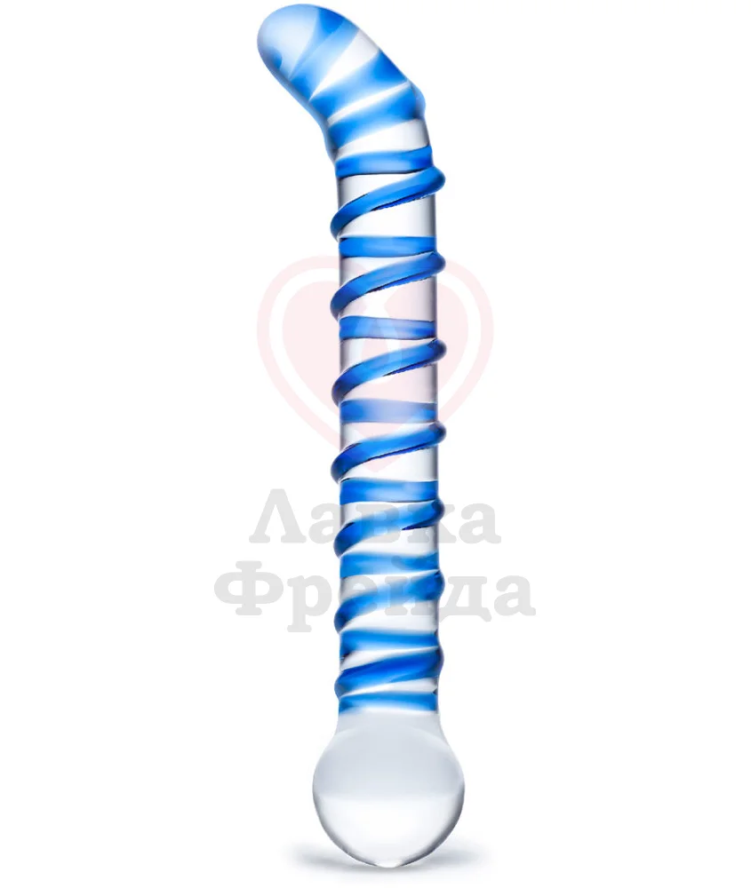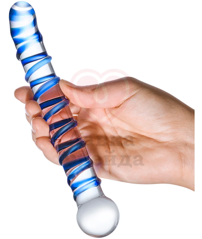 Синее и прозрачное стекло, соединилось вместе, и получился этот необычный, но стильный девайс. Его изогнутая форма идеально подходит для удовлетворения точки G, а расширение на ручке делает использование удобнее. Рельефный ствол доставит дополнительные ощущения при проникновении.
