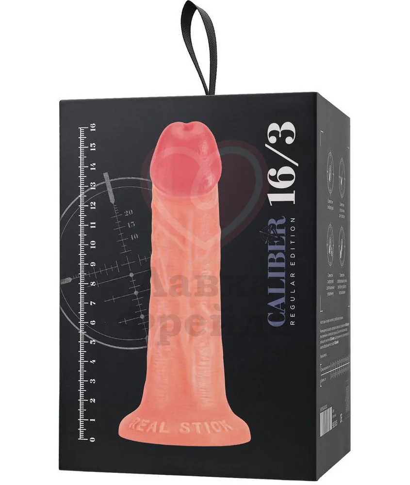 Реалистичный фаллоимитатор RealStick Caliber выполнен из гипоаллергенного силикона, совместимого со смазками только на водной основе. Материал легко очищается как специализированными спреями для игрушек, так и обычным мыльным раствором. Модель с выразительной, ярко очерченной головкой, телом, покрытым венозной сеткой, и круглой присоской, за счет которой фаллос можно установить практически на любой плоской поверхности. Также присоска совместима с трусиками для страпона с креплением колечком (трусики не входят в комплект).