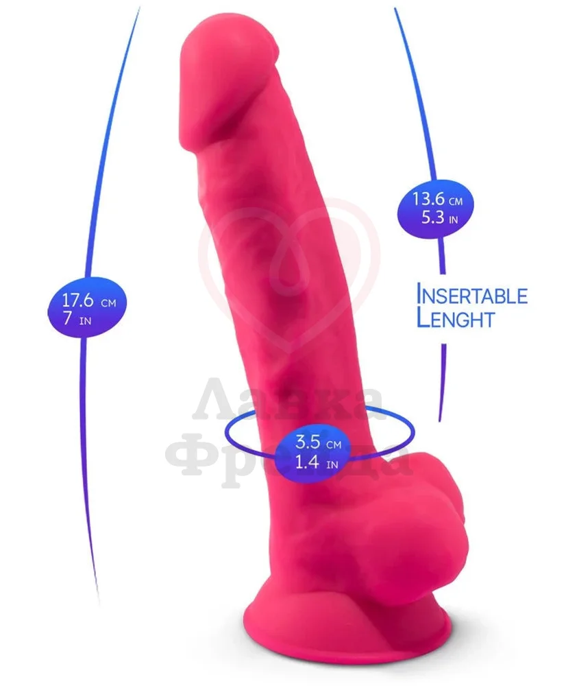 Ярко-розовый фаллос имеет выраженную головку, мошонку и круглую присоску в основании, что подходит для использования без рук или для страпона. Совместим со смазками только на водной основе, а чтобы очистить, воспользуйтесь специализированным антибактериальным средством для игрушек.