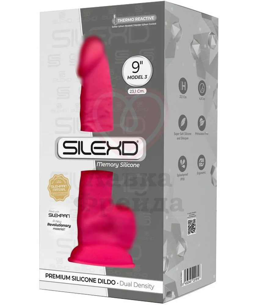 Фаллоимитатор Silexd Model 3 выполнен из ярко-розового медицинского силикона с наполнителем Silexpan двойной плотности. Материал адаптируется к температурным изменениям: при нагреве становится мягче, при охлаждении — твёрже. Для охлаждения поместите фаллос в холодильник — чем больше времени он там проведёт, тем жёстче станет. Для нагрева используйте микроволновку (30 секунд) или кипяток (2 минуты). Модель оснащена присоской для крепления к большинству плоских поверхностей и страпон-систем.