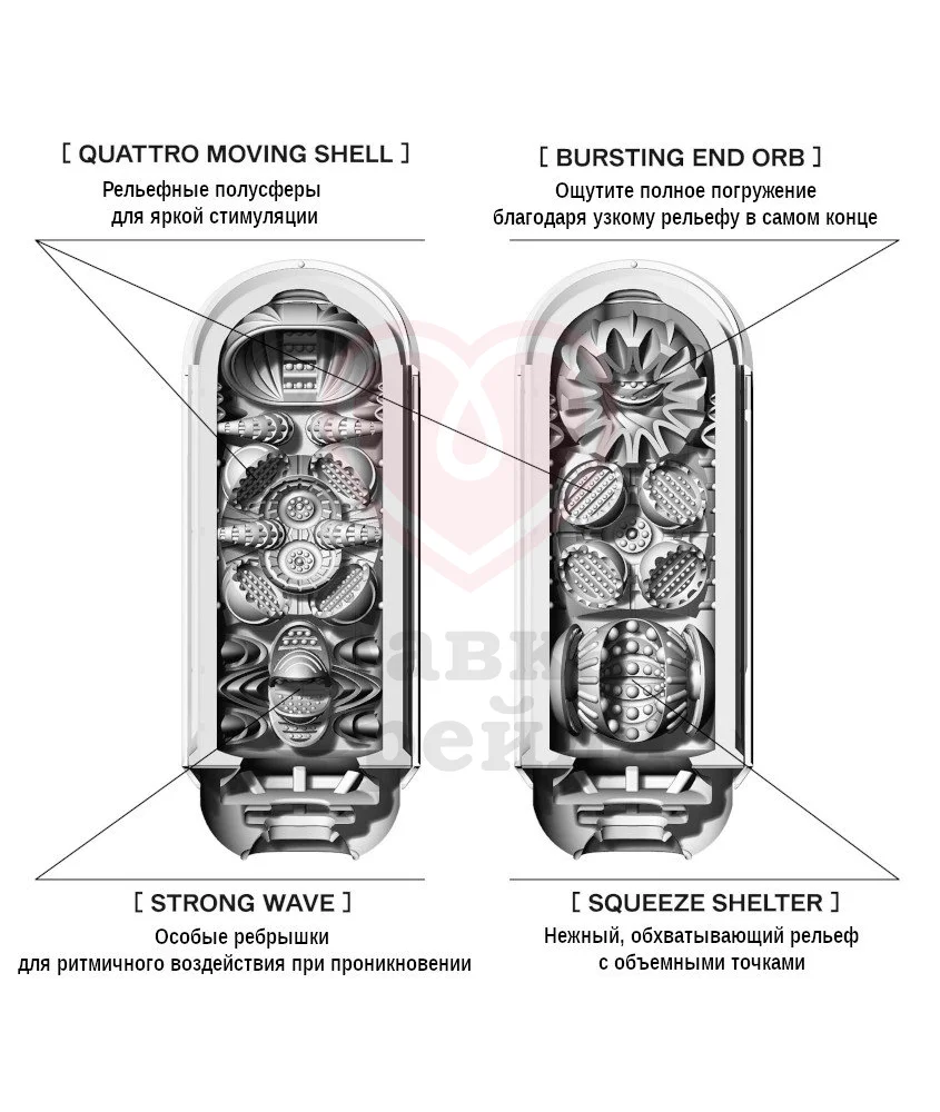 Главная особенность Tenga Flip Zero - гибкий корпус, позволяющий контролировать степень воздействия. Нажмите на специальные подушечки на корпусе игрушки, чтобы выпустить воздух и создать особенно сильный эффект вакуума. Потрясающе близкий контакт с внутренним рельефом из объемных полусфер, ребрышек и точек окажет ощутимую, супер-приятную стимуляцию!