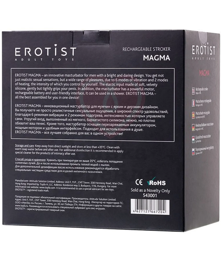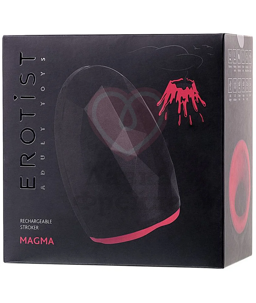 Мастурбатор Erotist Magma сочетает тактильную стимуляцию внутренней массажной поверхностью, 6 паттернов вибрации и 2 режима нагрева, которые создают эффект реалистичного контакта, усиливая возбуждение. Защищённое от влаги устройство можно недолго (до 30 минут) использовать в душе. Проникновение в упругий, тактильно приятный мастурбатор, будет еще комфортнее с лубрикантом на водной основе.