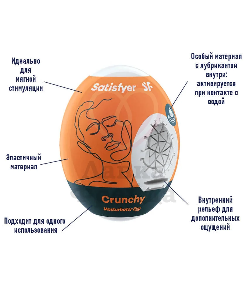 Нежное яичко изначально имеет компактные размеры - около 7 см в длину и 5 см в ширину, но эластичный материал помогает ему растягиваться до необходимых объемов. Игрушка предоставит полноценную стимуляцию по всей длине члена: от головки до самого основания. Особенный материал - термопластичный эластомер - уже имеет добавленный внутрь лубрикант. Именно поэтому применение такого мастурбатора максимально удобно: достаточно добавить немного воды, чтобы активировать смазку, и использовать его для вашего удовольствия. Версия Satisfyer Egg Crunchy скрывает внутри целую сеть из объемных абстрактных фигур, создавая необычное чередование объемного рельефа, волнительных изгибов и стимулирующих уголков.