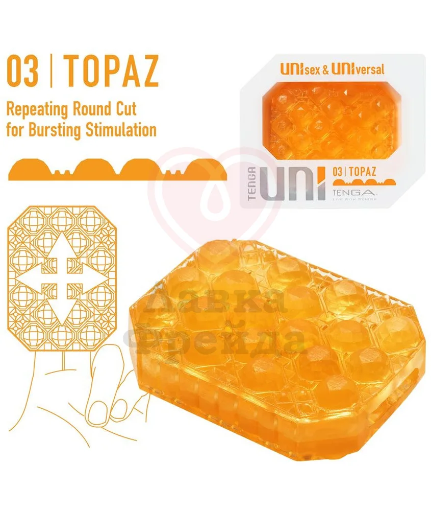 Коллекция Tenga Uni напоминает драгоценные камни, данный мастурбатор Topaz - яркий желтый топаз с фактурным внутренним рельефом в виде крупных округлых пупырышек, усиливающих наслаждение от стимуляции. В комплект входит образец лубриканта. Мастурбатор одноразовый.