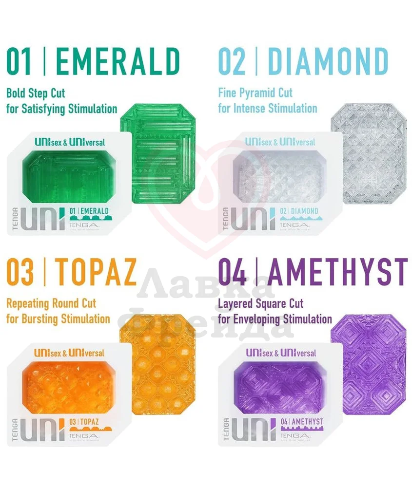 Набор Tenga Uni Variety Pack состоит из 4 мастурбаторов, каждый из которых имеет свой цвет и фактурный внутренний рельеф: