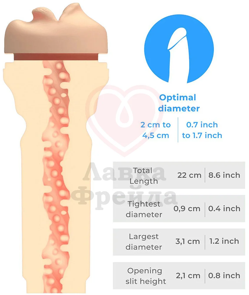 Удобный гладкий корпус мастурбатора выполнен из прочного пластика, его длина 20 см, а максимальный диаметр 8,5 см. Это прекрасная самостоятельная игрушка, которую легко удержать в ладонях: её вес оставляет 800 грамм.