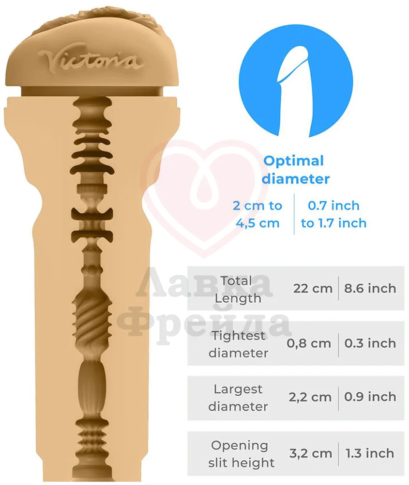 Корпус игрушки выполнен из прочного пластика: длина его составляет 20 см, а внешний диаметр 8,5 см. Внутри находится вставка из нежного эластомера со слепком вульвы и автографом Виктории Джун. Материал передает реалистичные ощущения, а плотный обхват и необычный рельеф обеспечит дополнительную стимуляцию.