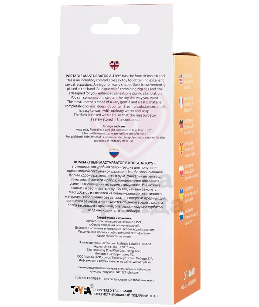 Оранжевая колба эргономичной формы удобно ложится в руку, не выскальзывая из ладони даже при интенсивном движении. Для более комфортного проникновения воспользуйтесь лубрикантом на водной основе, а для очистки используйте тёплый мыльный раствор и специализированное антибактериальное средство для игрушек.