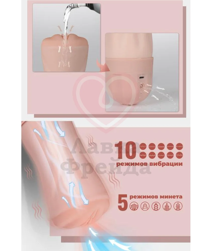 Мастурбатор Beata-2 имеет 10 режимов вибрации различной интенсивности, а также 5 режимов минета - всасывания, комбинация которых быстро приведет вас к яркому оргазму. Вход выполнен в виде вагины с нежными половыми губами, а сам тоннель для любви - фактурный, дополнительно стимулирующий член во время проникновения.