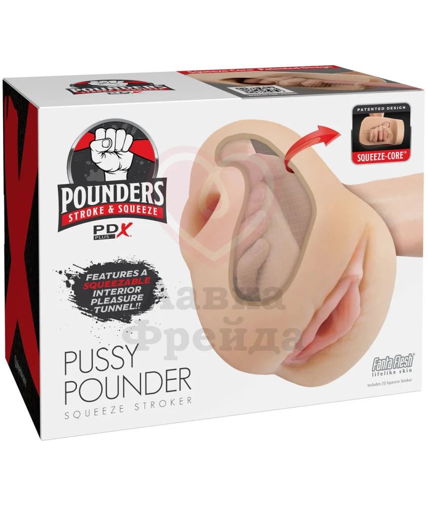 Pipedream Pussy Pounder Squeeze - мастурбатор с рельефной внутренней поверхностью: массажные бугорки и волны будут дополнительно стимулировать ствол по всей длине. Вход выполнен в виде реалистичной женской вагины. Полая конструкция даёт возможность сжимать тоннель руками, экспериментируя с давлением и необычными ощущениями. В задней части находится специальное отверстие, куда можно вставить вибропулю (в комплект не входит).
