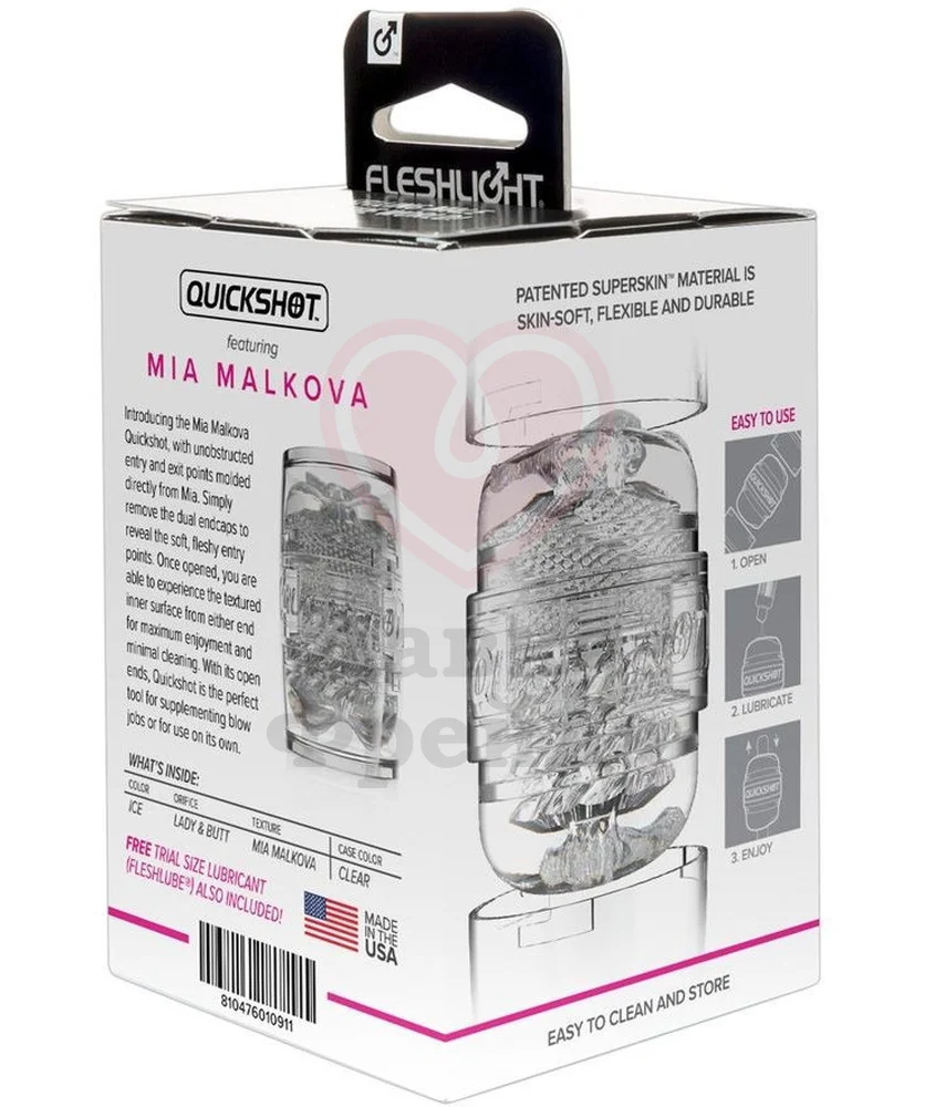 Fleshlight Quickshot Mia Malkova входит в серию компактных сквозных мастурбаторов Флэшлайт, а также в популярную серию с порно-звёздами Signature Girls. Сохраняя форму и очертания маленьких мастурбаторов Quickshot, новинка также имеет реалистичные слепки-копии с вагины и попки знаменитой актрисы Миа Малкова. Девушка уже не первый раз сотрудничает с брендом, до этого компания выпускала классические Флешлайты в полном размере с её участием, как мастурбатор с копией вагины, так и попки. А теперь в новом формате Quickshot вас ждут все удовольствия сразу: