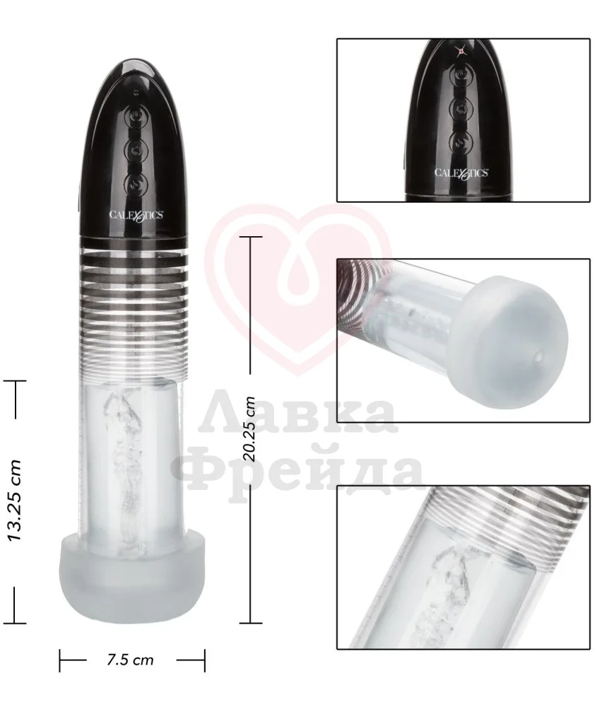 Сама колба очень прочная, а силиконовая манжета обеспечивает идеальную герметизацию для 3-х режимов силы вакуума - для начинающих, продвинутых и опытных пользователей. Управление происходит кнопками включения/выключения, выбора режимов всасывания и сброс давления.
