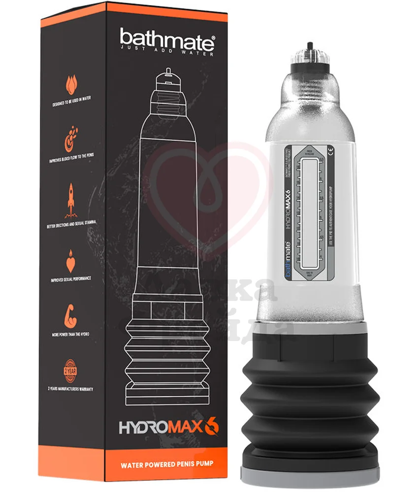 Улучшенная версия гидропомп Bathmate - Hydromax6 еще эффективнее. Использовать гидропомпу Bathmate стало удобнее, а добиться результата проще! Отличия между моделями в размерах колбы. Bathmate Hydromax6 использует силу воды, чтобы эффективно и безопасно увеличить размер вашего члена.