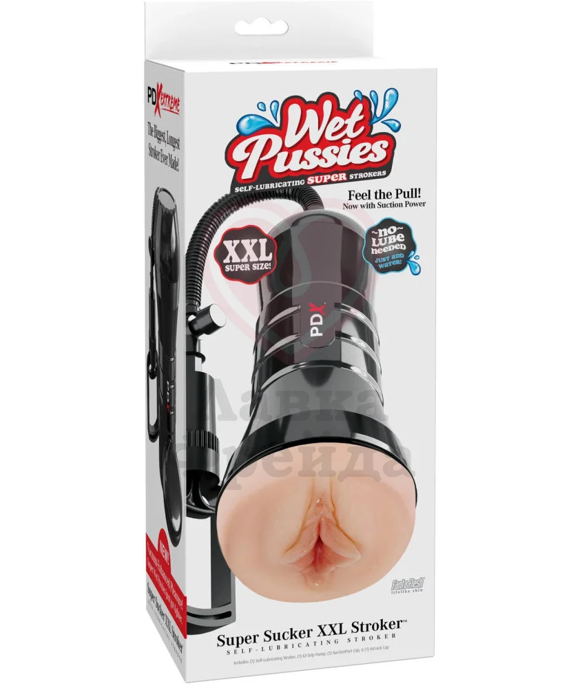 Мастурбатор Pipedream Wet Pussies Super Sucker XXL Stroker имеет вход в виде вагины, самосмазывающуюся внутреннюю поверхность и помпу, создающую всасывающий эффект. Для более скользящего и комфортного проникновения, нанесите немного воды, чтобы получить слой естественного лубриканта, которого хватит до 10 применений. После десятого раза используйте смазку на водной основе.