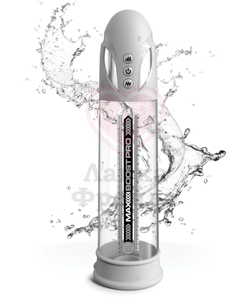 Max Boost Pro Flow сочетает в себе сразу два девайса - вакуумную помпу и мастурбатор. Имеет 4 уровня всасывания, 4 скорости работы автоматической системы "всасывание и выпуск", а также ручной режим. Аксессуар полностью защищен от влаги, поэтому с ним можно играть в ванной, душе или бассейне, однако не рекомендуется держать устройство в воде дольше получаса.