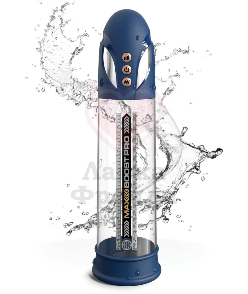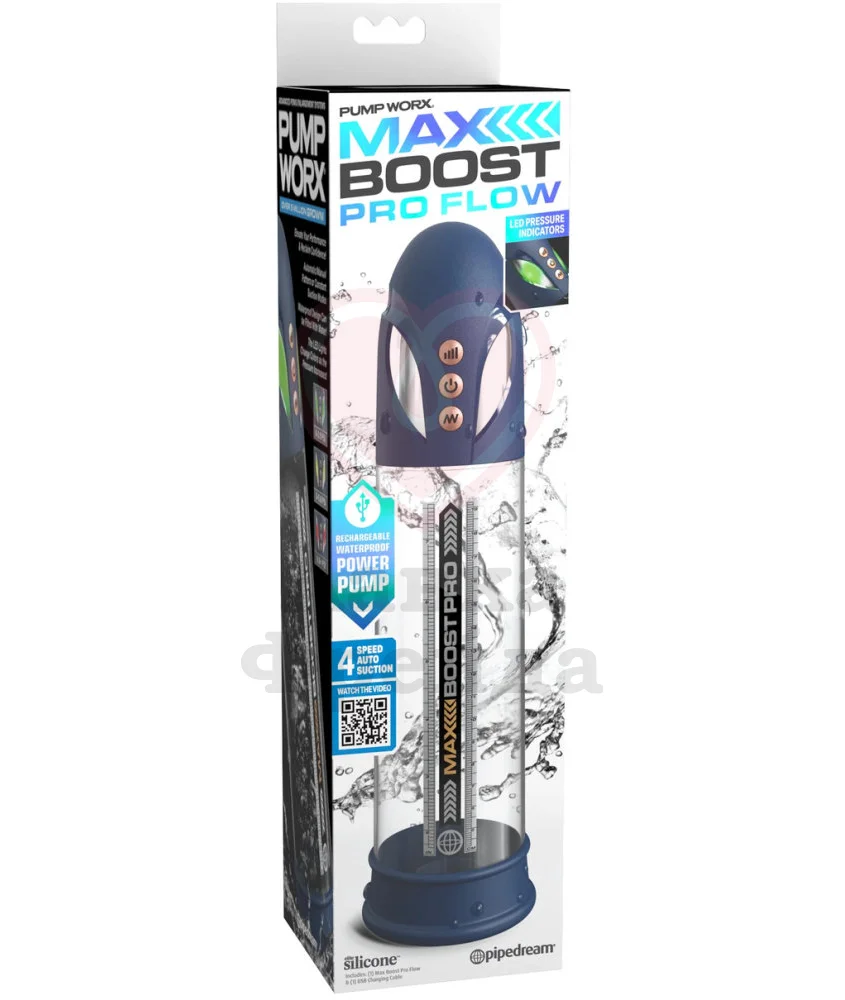 Max Boost Pro Flow сочетает в себе сразу два девайса - вакуумную помпу и мастурбатор. Имеет 4 уровня всасывания, 4 скорости работы автоматической системы "всасывание и выпуск", а также ручной режим. Степень влагозащиты - IPX7, поэтому с ней можно играть в ванной, душе или бассейне, однако не рекомендуется держать устройство в воде дольше 30 минут.