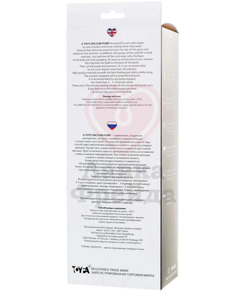 Вакуум создаёт нужную силу давления, что способствует лучшему кровообращению, а высокое качество используемых материалов сделают эксплуатацию не только приятной, но и безопасной. Для большего комфорта возьмите лубрикант на водной основе, а для очистки используйте специализированное антибактериальное средство для игрушек.