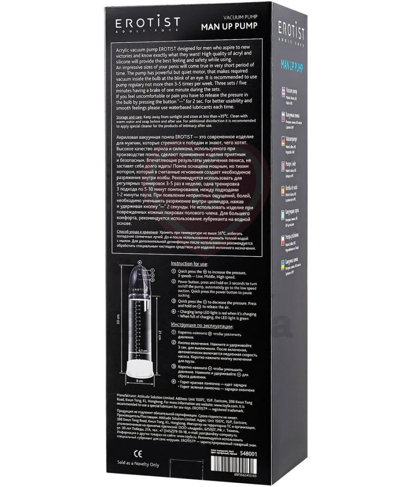 Помпа для увеличения члена Erotist Man Up Pump имеет автоматическую систему управления - в считанные мгновения кнопками на корпусе настройте желаемый уровень вакуума, переключаясь между 3 скоростями откачки воздуха. Через прозрачный пластик вы можете тщательно контролировать процесс и точно регулировать уровень вакуума, а также в режиме реального времени наблюдать, как ваш ствол становится длиннее и толще.