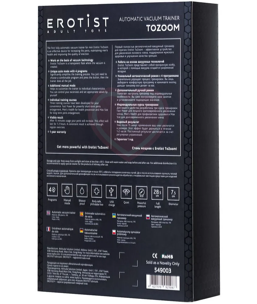 Тренажёр Erotist Adult Toys ToZoom использует вакуумное воздействие для стимуляции кровотока в тканях мужского ствола, что при регулярных занятиях улучшит общее качество эрекции и сделает член визуально крупнее. При однократном использовании - 15-минутная тренировка, фаллос станет больше на 1-1,5 часа.