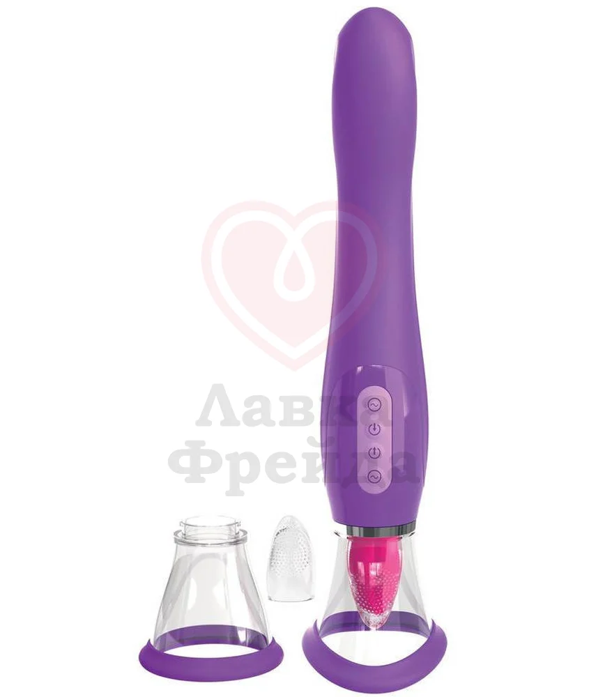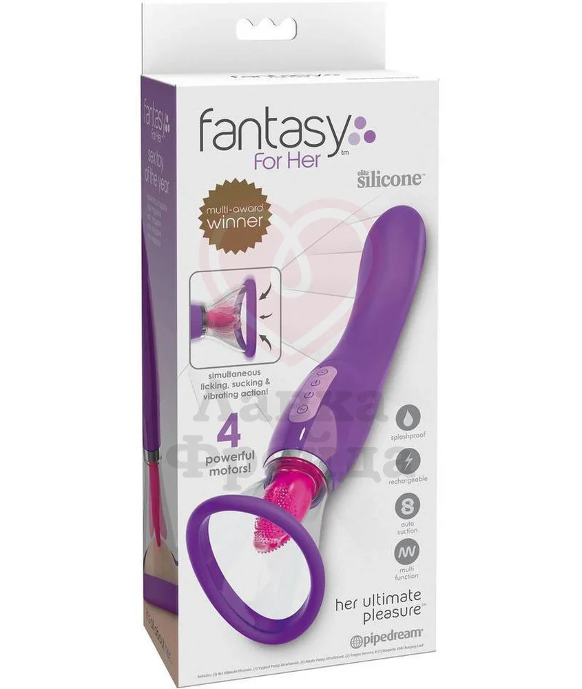 На одной стороне Fantasy For Her Ultimate Pleasure находится помпа с двигающимся язычком, имитирующим оральные ласки, а с другой - силиконовый вибратор с 10 режимами работы. Небольшой изгиб игрушки и округлая головка комфортно ложится на переднюю стенку вагины, активно стимулируя зону G.
