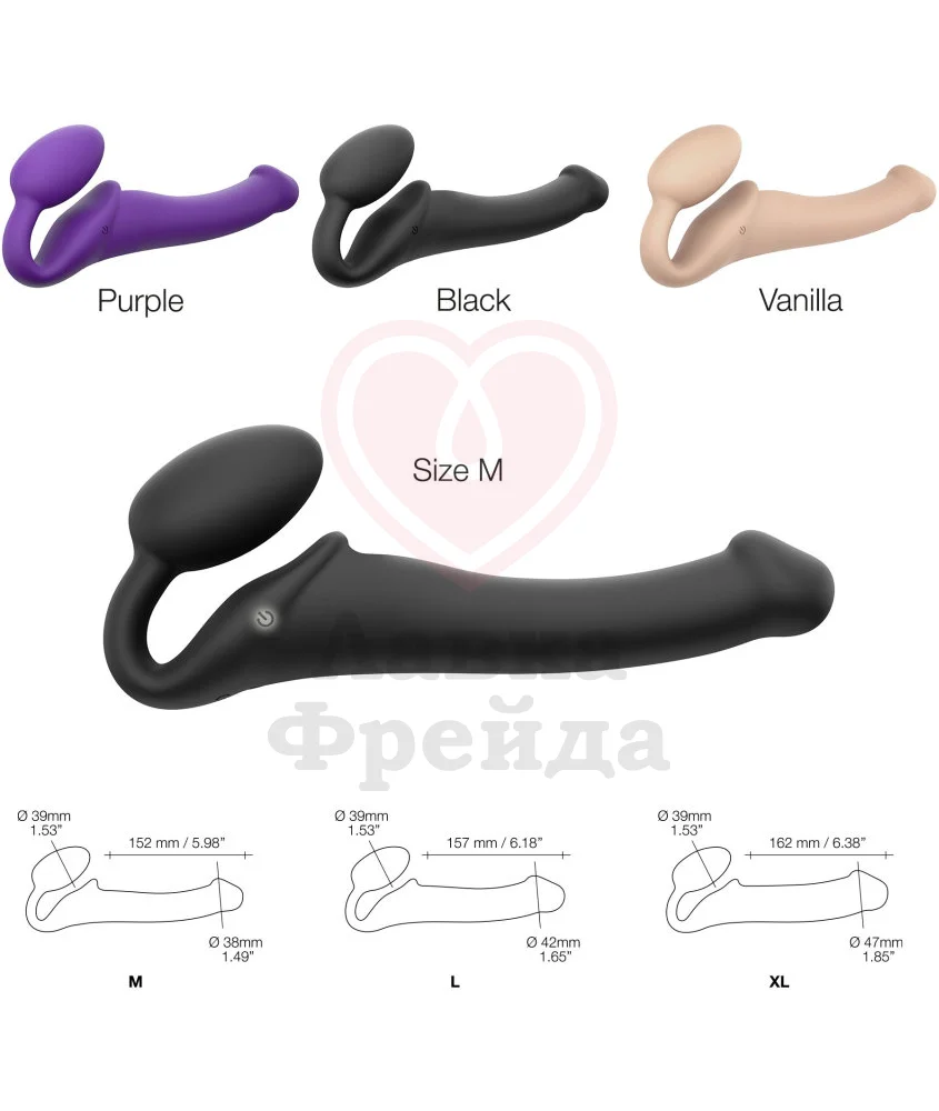 Серия Vibrating Bendable Strap-on-me — это коллекция прекрасных эргономичных безремневых страпонов, которые имеют место для сгиба и целых 3 мотора для вибрации. Удобная и практичная игрушка, которая подстраивается под ваши желания. Каждый из моторов находится в самом нужном месте: