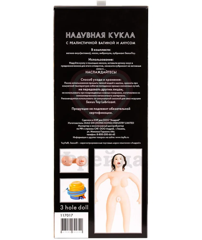 Надувная кукла Dolls-X by Toyfa Gabriella имеет три функциональных отверстия - ротик, вагину и попку. Каждое отверстие имеет разную глубину и степень упругости стенок, позволяя экспериментировать с ощущениями. Привлекательное лицо, тёмные волосы и изгибы тела, приближённые к анатомически, подарят эффект живого контакта и естественных ощущений при взаимодействии.